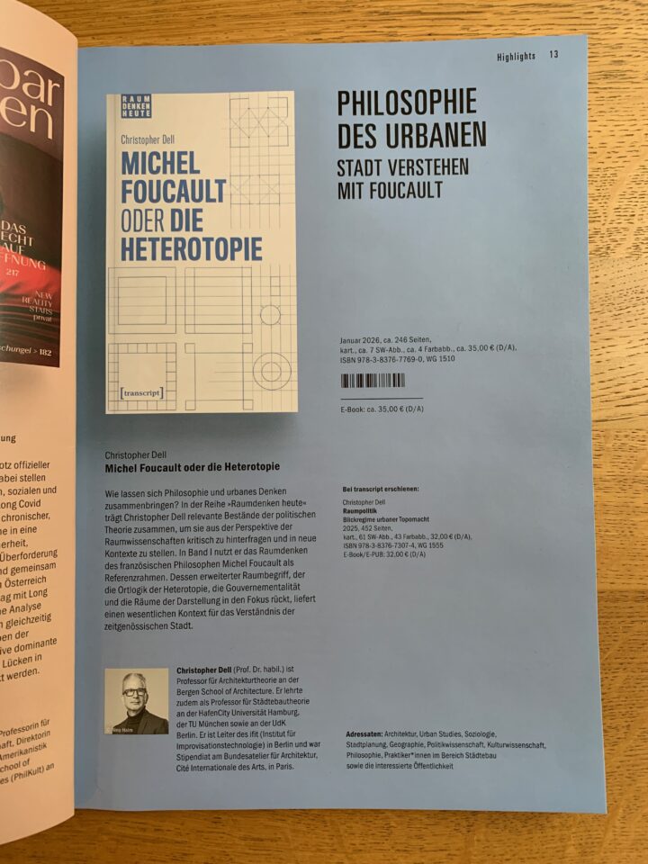 with this book I investigate the spatial thinking of Michel Foucault in respect to the notions of heterotopia, governmentality and biopolitics as well as Foucaults specific epistemological understanding of the interweaving of knowledge and representation. This volume marks the beginning of the series ‘Raumdenken heute’ (Spatial Thinking Today) which investigate modes of spatial thinking within the realm of political philosophy. In the series, I compile relevant works of political philosophy in order to critically examine them from the perspective of spatial sciences and place them in new contexts.